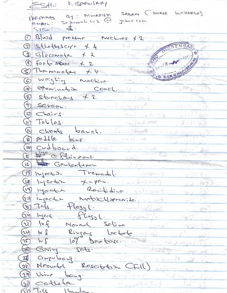 1 tavolo, 3 sedie, una panca, 4 termometri e un lettino per visitare.. una bilancia per pesare i neonati, e poi la lista delle medicine importanti. Ci siamo messe all’opera e siamo riusciti a portare ad Eshu, tutto ciò che era stato chiesto e abbiamo anche raddoppiato le quantità.